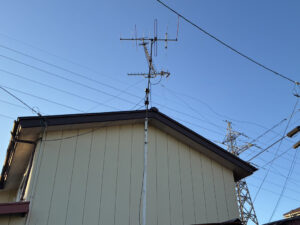今回のお客様からは「自分で取り付けたアンテナがあるが、視聴できないチャンネルがある。しっかりとテレビが見られるように施工し直してほしい」というお問い合わせをいただきました。 現場へ駆けつけ確認したところ、お客様ご自身で設置されたアンテナが、経年劣化によって固定が緩み、非常に不安定な状態になっていました。アンテナの向きがわずかにズレると、デジタル放送の電波は受信感度が著しく低下します。それが原因で、一部のチャンネルがブラックアウトする、あるいはノイズが走るという症状が発生していました。
