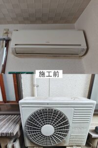 まずはお伺いして現状の点検を行いました。設置されていたのは長年使用されている日立製のエアコンです。